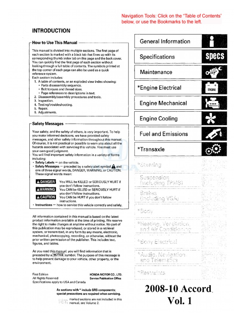 Honda Accord Repair Manual 2003-2007 models: Honda Accord Seventh Generation Acura TSX years: 2003-2007 engines: 2.4L (K24A4) DOHC i-VTEC 4 Cylinder 3.0L (J30A4) SOHC VTEC V6 transmissions: Automatic & Manual item-format: .PDF. Honda Accord Repair Manual 2008-2012.. A good repair manual can save you a lot of money in the long run, both in work on the car and in terms of sourcing technical help most of all, a service manual provides peace of mind. Where Can I Find A Honda Service Manual? The best place to look for a Honda service manual is right here on this site, where they are free for download.. Honda manuals Download and view online Honda vehicle owner’s manuals, user and instruction guide in English and pdf format. Find service, driving, repair and more manuals by browsing our pages or using the search engine..