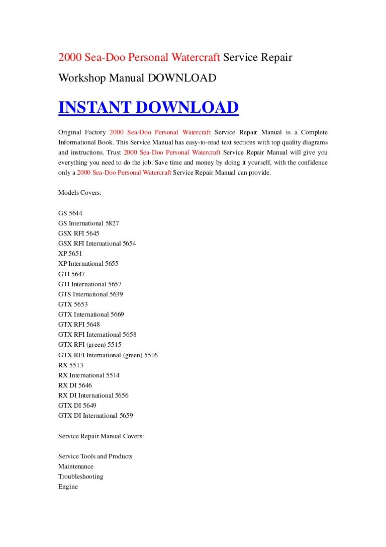 2000 Sea Doo Service Manual Download - View and Download Sea-doo Speedster operator's manual online. Speedster Boat pdf manual download. Also for: Challenger x, Challenger 1800, Challenger 2000.. View and Download Sea-Doo GS 5626 operator's manual online. Jetski. GS 5626 Boat pdf manual download. Also for: Gts 5819, Gti 5836, Gtx limited 5837, Spx 5838, Spx 5839, Xp limited 5665, Xp limited 5667, Gsx limited 5629, Gs 5626 1998, Gts 5819 1998, Gti 5836 1998, Gtx limited 5837. Have a question about our manuals, the download process, or purchasing? Click here for answers!.