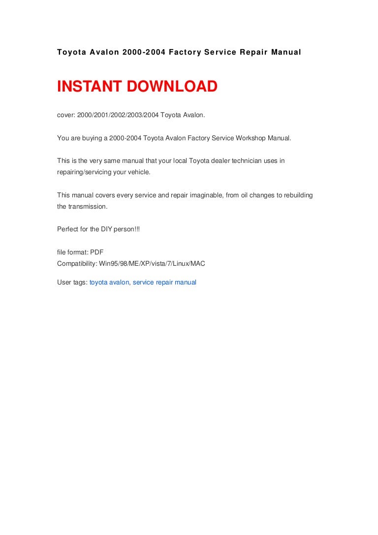 2002 Toyota Avalon Owner Manual - View and Download Toyota Avalon 2002 operating manual online. Avalon 2002 Automobile pdf manual download.. Toyota Camry: 2002 thru 2006 - Avalon & Lexus ES 300/330 (2002 thru 2006) - Solara (2002 thru 2008) (Haynes Repair Manual) [Haynes] on Amazon.com. *FREE* shipping on qualifying offers. With a Haynes manual, you can do it yourselffrom simple maintenance to basic repairs. Haynes writes every book based on a complete teardown of the vehicle.. View and Download Toyota 2004 Avalon owner's manual online. 2004 Avalon Automobile pdf manual download..