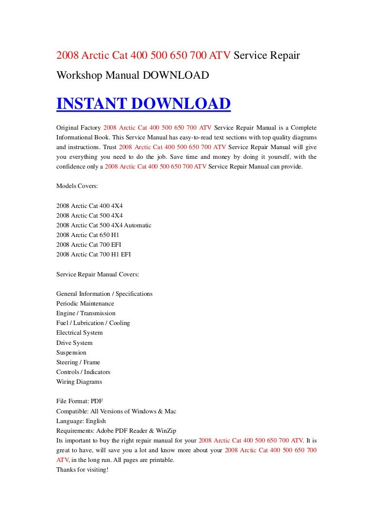 2008 Arctic Cat 400 500 650 700 Atv Repair Manual Pdf - View and Download Arctic Cat 400 4x4 operator's manual online. ATV. 400 4x4 Offroad Vehicle pdf manual download. Also for: 500 4x4, 400 4x4 3in1, 650 h1, 650 h1 3in1, 700 diesel, 500 4x4 3in1.. Download a repair manual to your computer, tablet or smart phone instantly. All listed manuals are in pdf format for quick, easy download. No special software needed to download a manual.. ATV repair manual downloads available for Yamaha, Suzuki, Arctic Cat and Polaris all-terrine vehicles. A downloadable all-terrain vehicle repair manual is an electronically delivered instructional handbook for leaning how to service or restore the off-road vehicle to working order..