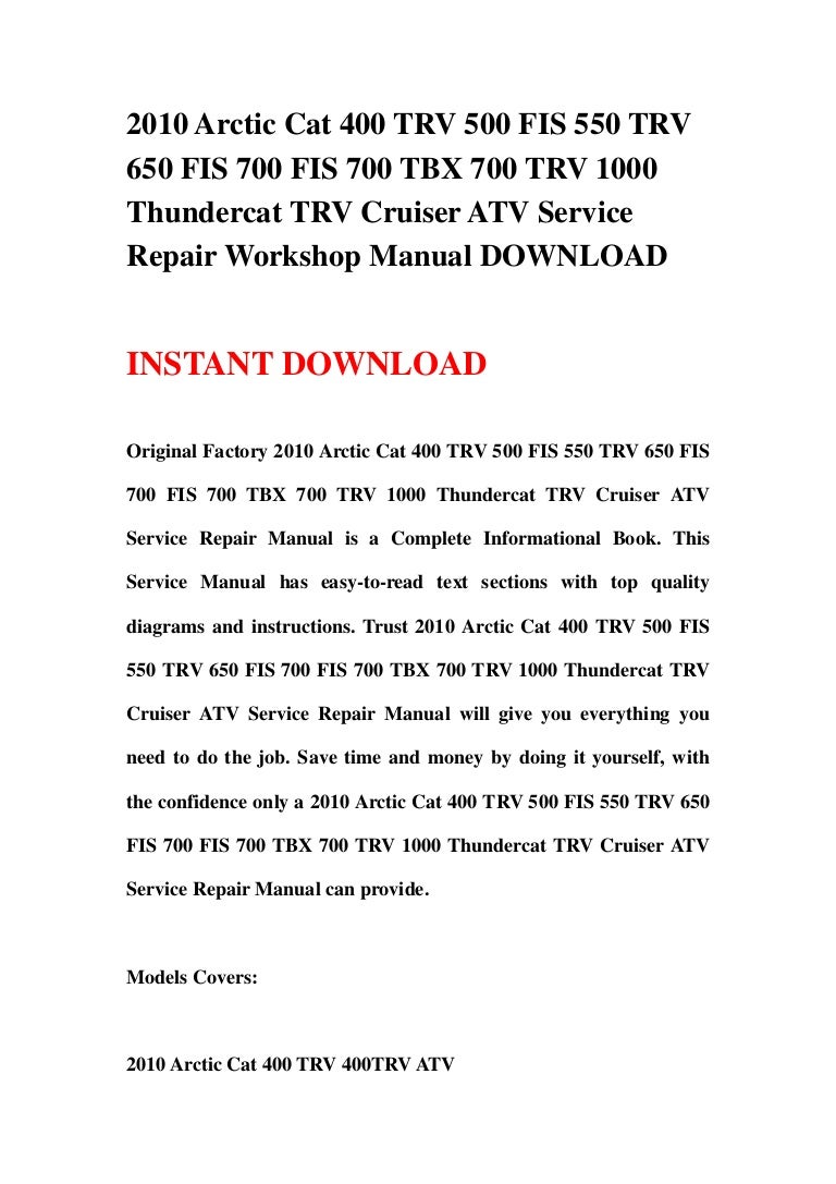 2010 Arctic Cat 400 Trv 550 Fis/trv 650 Fis 700 Fis/tbx/trv Thundercat 1000 Trv Cruiser Mud Pro ATV Service Repair Workshop Manual This is the Complete Official Workshop Service and Repair Manual for for certain 2010 Arctic Cat ATV models.. Instant download of the factory repair manual for 2010 arctic cat 400 to 1000 4x4 atvs see below for models covered covers complete tear down and rebuild pictures and part diagrams torque specs maintenance troubleshooting etc have a problem instant download 2011 arctic cat 400 trv 400trv 44 atv service repair workshop manual fix it keep your all terrain vehicle running smoothly arctic cat. 2010 arctic cat 700 diesel atv (super duty diesel engine)- factory service / repair / workshop manual – instant download !! a must for every “2010 arctic cat 700 diesel atv” owner !!.