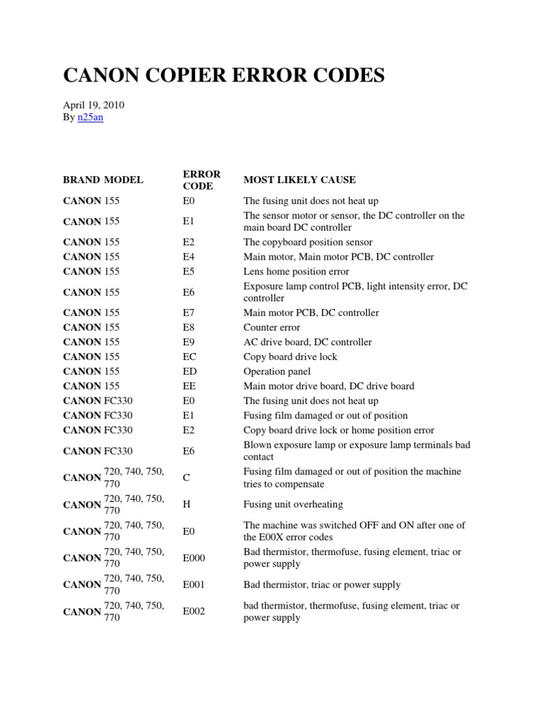 CANON COPIER ERROR CODES.docx | Canon Inc. | Power Supply