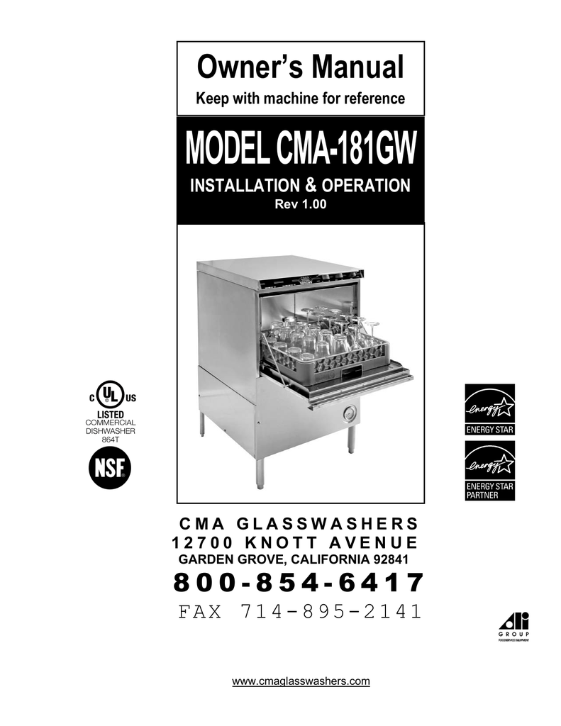 Cma Eah T Dishwashers Owners Manual - Download fast and free CMA Dishmachines Dishwasher manuals at this page. You can find the CMA Dishmachines Dishwasher manuals that you need.. On this page you can see the full list of devices for CMA Dishmachines manufacturer. en-manuals.com ru Find any user`s manual: For example: Sony VGN-FW460J/T. Home; CMA Dishmachines. User's manuals for CMA Dishmachines devices, user's guides and owner's manuals download free. Share. Share; Plus; Dishwasher; 1; Related questions. If, due to the improper installation of CMA equipment, this equipment ceases to operate properly or affects other parts of the CMA dishwashing equipment, in that the other parts become defective, the CMA warranty becomes void. CMA will not be liable or responsible or warrant CMA equipment, due to improper installation of any CMA model dishwasher..