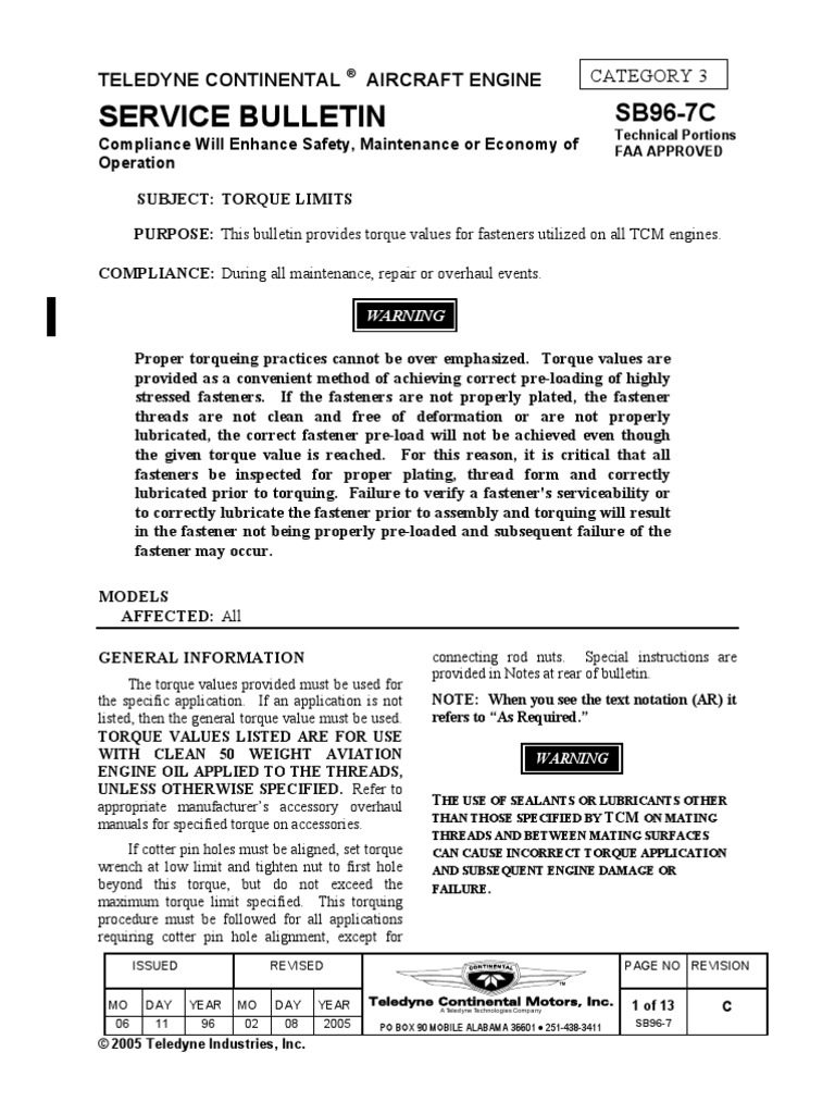 Continental Gtsio 520 Overhaul Manuals Gtsio520 - ISSUED REVISED P.O. Box 90 Mobile, AL 251-436-8299 PAGE NO DOC NO REVISION 1996/08/15 2015/08/10 1 of 2 MSB96-10 B ©2015 Continental Motors, Inc..