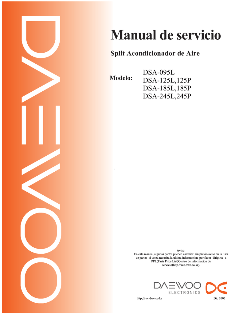 Search among more than 1.000.000 user manuals and view them online in .pdf. DAEWOO DSA-240L-R AIR CONDITIONER REPAIR Manual This service repair manual written in PDF format contains every information you will ever need for repairing, servicing, rebuilding or maintaining your DAEWOO DSA-240L-R SPLIT SYSTEM AIR CONDITIONER.. Daewoo DSB-090L Service Manual . Download Service manual of Daewoo DSA-100L Air Conditioner for Free or View it Online on All-Guides.com. This version of Daewoo DSA-100L Manual compatible with such list of devices, as: DSA-100L, DSA-120L, DSB-090L, DSB-120L.