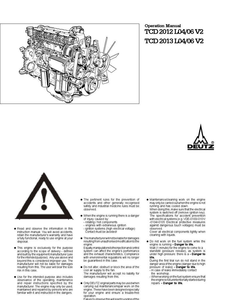 Deutz Tcd 2013 4v Diesel Engine Workshop Service Manuals - View and Download Deutz TCD 2013 L04 4V operation manual online. TCD 2013 L04 4V Engine pdf manual download. Also for: Tcd 2013 l06 4v: tcd 2013 l06 4v.. Our partners will collect data and use cookies for ad personalization and measurement. Learn how we and our ad partner Google, collect and use data.. DEUTZ Diesel engine PDF Spare parts catalogs, Service and Operation Manuals. Spare parts for Deutz diesel engine. Please see the Home Page with explanation how to order and receive Manuals and Code Books..
