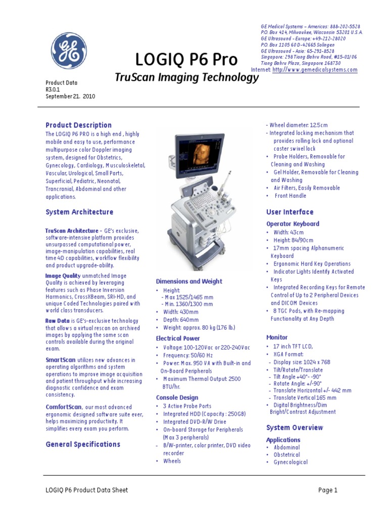 Ge Logiq P6 User Manual - Have a look at the manual GE Logiq P5 User Manual online for free. It’s possible to download the document as PDF or print. UserManuals.tech offer 45 GE manuals and user’s guides for free.. LOGIQ P6 PRO R3.X.X GE HEALTHCARE DICOM CONFORMANCE STATEMENT 6308877-100 REV 2.0 CONFORMANCE STATEMENT OVERVIEW The LOGIQ P6 PRO is a self-contained networked computer system used for acquiring ultrasound diagnostic medical images.. GE LOGIQ S8 Ultrasound Basic User Manual. This LOGIQ S8 Basic User Manual contains Introduction, Safety, Preparing the System for Use, Preparing for an Exam, Optimizing the Image, Scanning/Display Functions, General Measurements and Calculations, Abdomen and Small Parts, OB/GYN, Cardiology, Vascular, Urology, Pediatrics, ReportWriter, Recording.