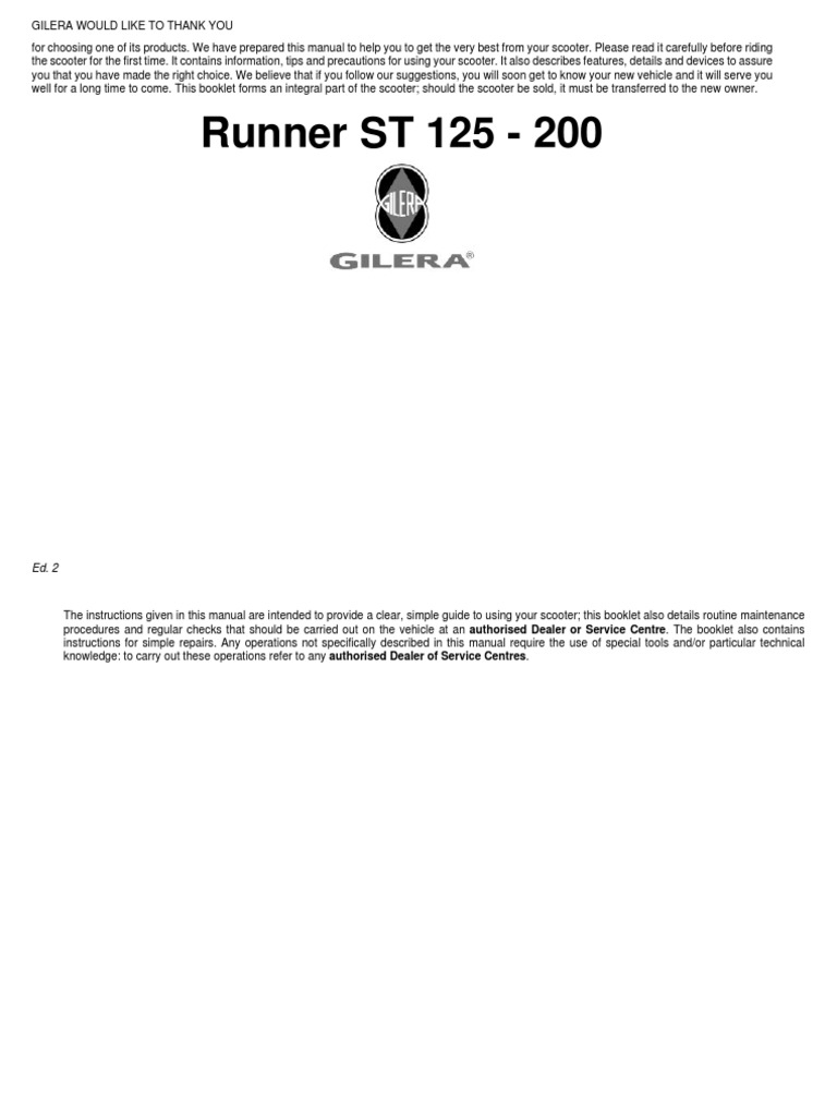 You will be able to use the search function to browse the manual and print out your needed pages. This Factory Service Repair Manual will guide you through fundamentals of maintaining and repairing, step-by-step, to teach you what the factory trained technicians already know by heart. By applying the knowledge in this service repair manual, any. GILERA WOULD LIKE TO THANK YOU for choosing one of its products. We have prepared this manual to help you to get the very best from your scooter. Please read it carefully before riding the scooter for the first time. It contains information, tips and precautions for using your scooter. Runner ST 125 - 200. Jun 30, 2013 gilera runner vxr 200 manual download gilera runner vxr 200 repair manual gilera runner vxr 200 manual gilera runner vxr 200 service manual www.youtube.com. Gilera club. Gilera 125 Rallye Apache Coguar Dakota DNA Eaglet EC ECO 50 ER Fastbike Fuoco GFR GP In 1935, Gilera acquired rights to the Rondine four-cylinder engine..