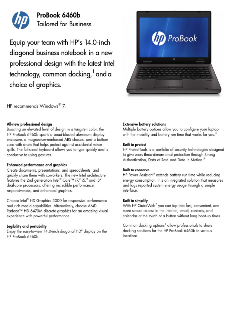 HP ProBook 6460b Notebook PC Datasheet | Laptop | Windows Vista
