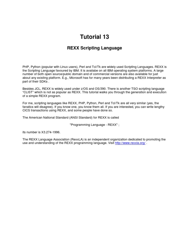 All IBM Manuals on mainframe REXX z/OS V1R4.0 Using REXX and z/OS UNIX System Services IBM Bookmgr Bookshelf: z/OS V1R4.0 TSO/E REXX Reference z/OS V1R2.0 TSO/E REXX User's Guide. Abstract. This techdoc supplements the earlier Techdoc z/OS Communications Server TCP/IP: Hints and Tips. It indicates where to find additional hints and tips for all z/OS Communications Server TCP/IP users, and for a number of widely used z/OS Communications Server TCP/IP functions.. Job Control Language (JCL) is a name for scripting languages used on IBM mainframe operating systems to instruct the system on how to run a batch job or start a subsystem..