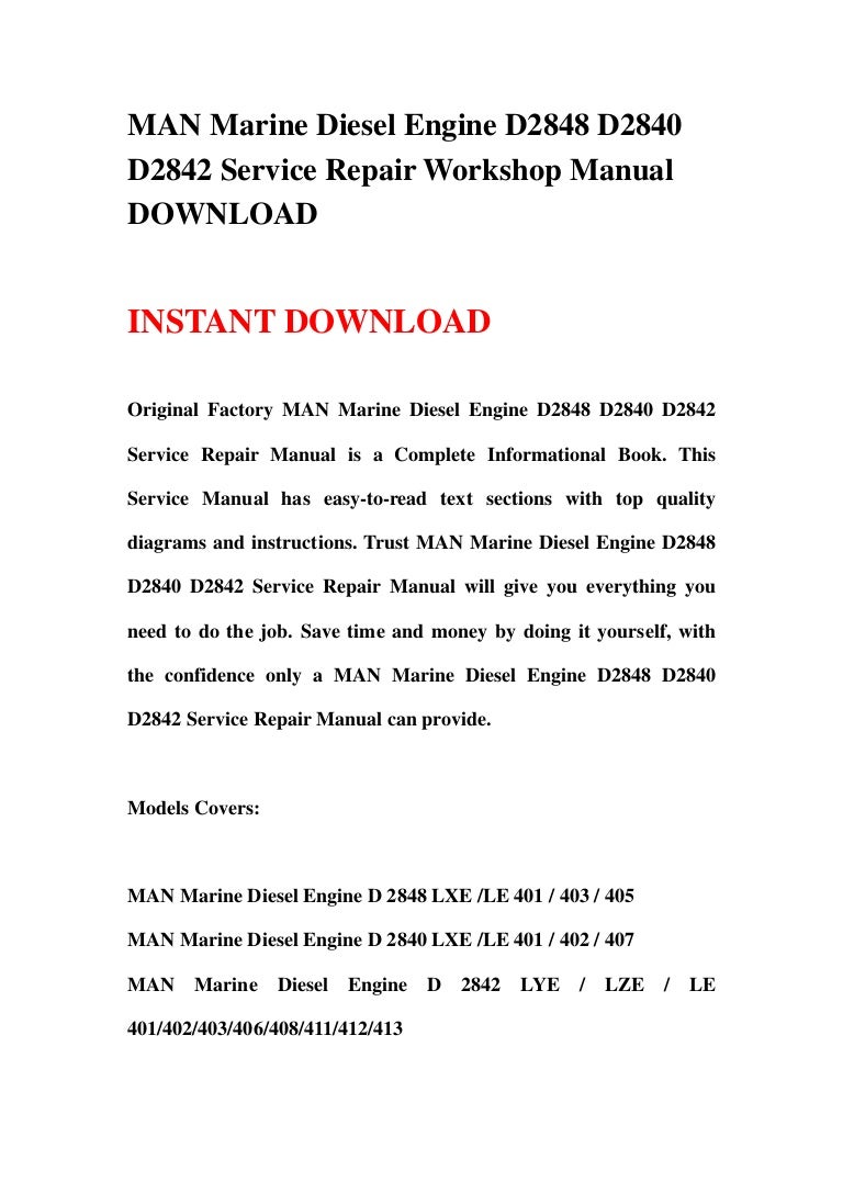 Man Marine Diesel Engine D2848 D2840 D2842 Repair Manuals - FREE PDF Download MAN D2840 Online service repair manual PDF by Just Give Me The Damn Manual. Skip to content. Just Give Me The Damn Manual PDF Workshop Service Repair Manuals. man marine diesel engines - man d0226me, man d0226mte, man d0226mle, man d0826le40, man d2866e, man d2866te, man d2866lxe42, man d2866le403, man d2866le402, man. MAN Dealers MAN Latest News: MAN Forums MAN Library: MAN specifications, ratings, photographs, data sheets, drawings, manuals, forums latest product news..