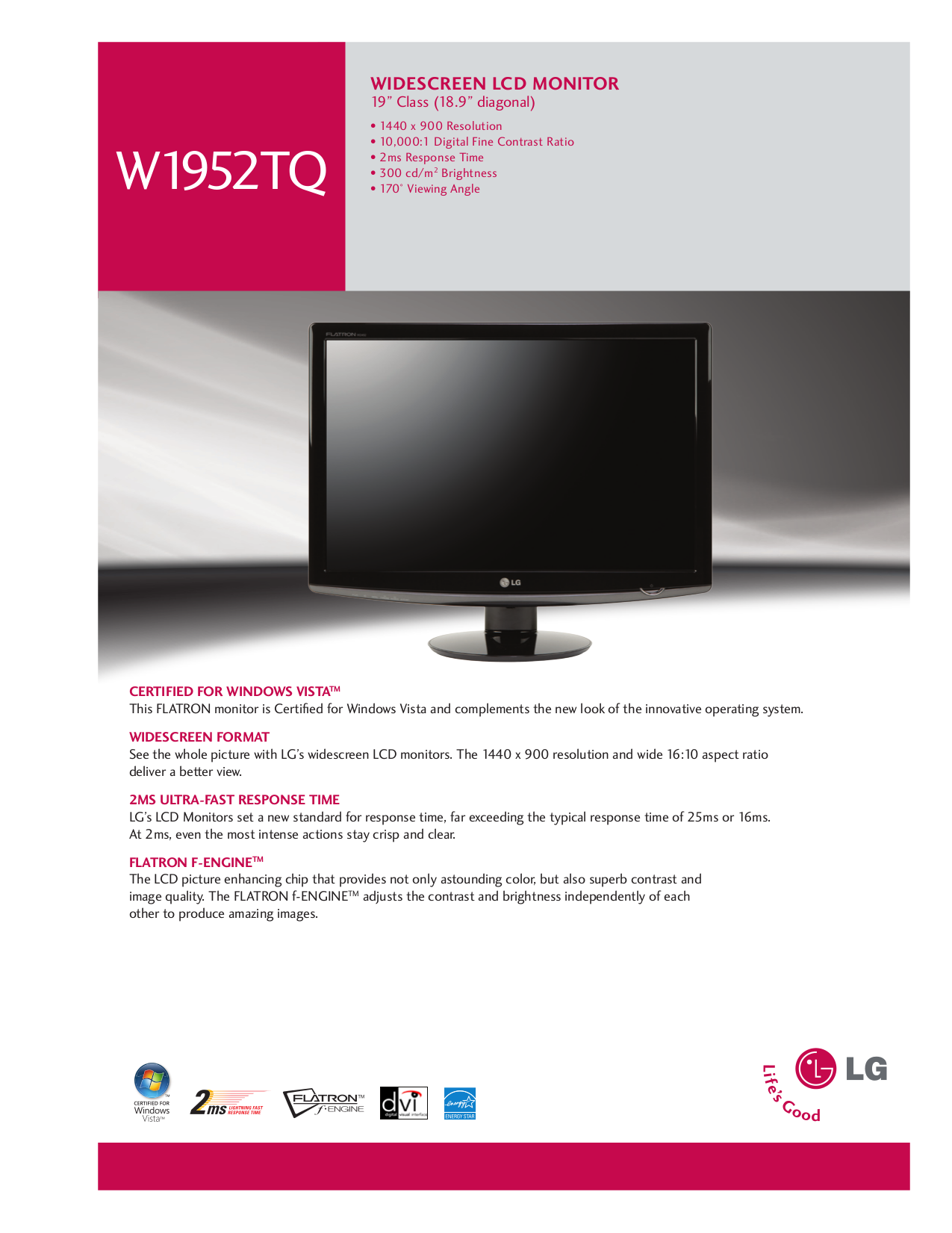 Manuals Monitor Lg Flatron W1952tq - Manuals; Brands; LG Manuals; Monitor; W1952TQ - - 19" LCD Monitor; LG W1952TQ - - 19" LCD Monitor Manuals Manuals and User Guides for LG W1952TQ - - 19" LCD Monitor.. The LG.com website utilises responsive design to provide convenient experience that conforms to your devices screen size. In order to get the best possible experience our LG.COM website please follow below instructions.. By pressing 'print' button you will print only current page. To print the manual completely, please, download it..