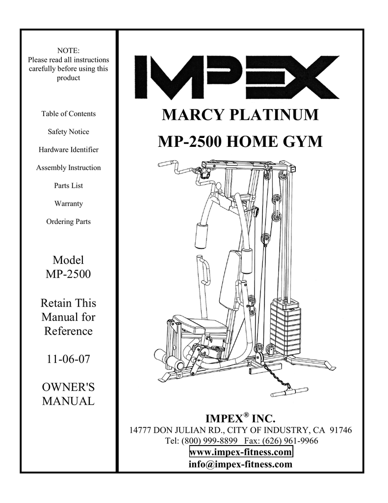 Marcy Mp2500 Home Gym Manuals - Get Impex MP-2105 Marcy Platinum MP-2105 Home Gym Owner's Manual. Get all Impex manuals!. Jul 13, 2016 · The Marcy MWM-988 Total Home Gym System is an all-in-one home gym system that allows you to get a full body strength training workout in the comfort of your own home. This powerful, comprehensive machine is great for both experienced strength trainers and beginners who want to start building muscle and burning fat.. Impex Home Gyms MARCY MP-4500 User's Manual download free. We offer you a User's Manual of Impex MARCY MP-4500: PDF file 5.07 Mb, 37 pages. On this page you can download this User's Manual and read it online..