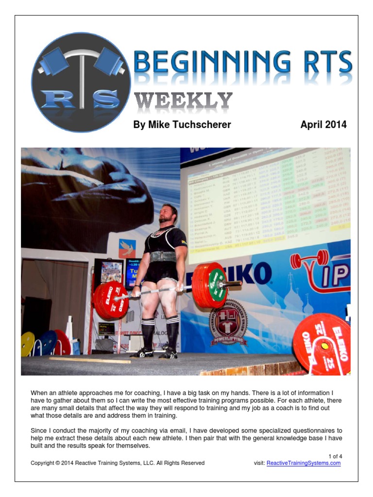 Tags: 800lbs big mike deadlift michael tuchscherer mike t mike tuchscherer reactive training manual rts tuchscherer. Oct 25 2013 October 25, 2013 December 30, 2018 by admin. Periodize Your Training with Block Periodization Posted in Powerlifting, Training.. Mike began coaching in 2004 when he took over as the Cadet-in-Charge of the USAFA Powerlifting club. After he graduated in 2007, he wrote about what he had learned in his first book, “The Reactive Training Manual”. The book taught lifters how the concept of RPE could be adapted to lifting..