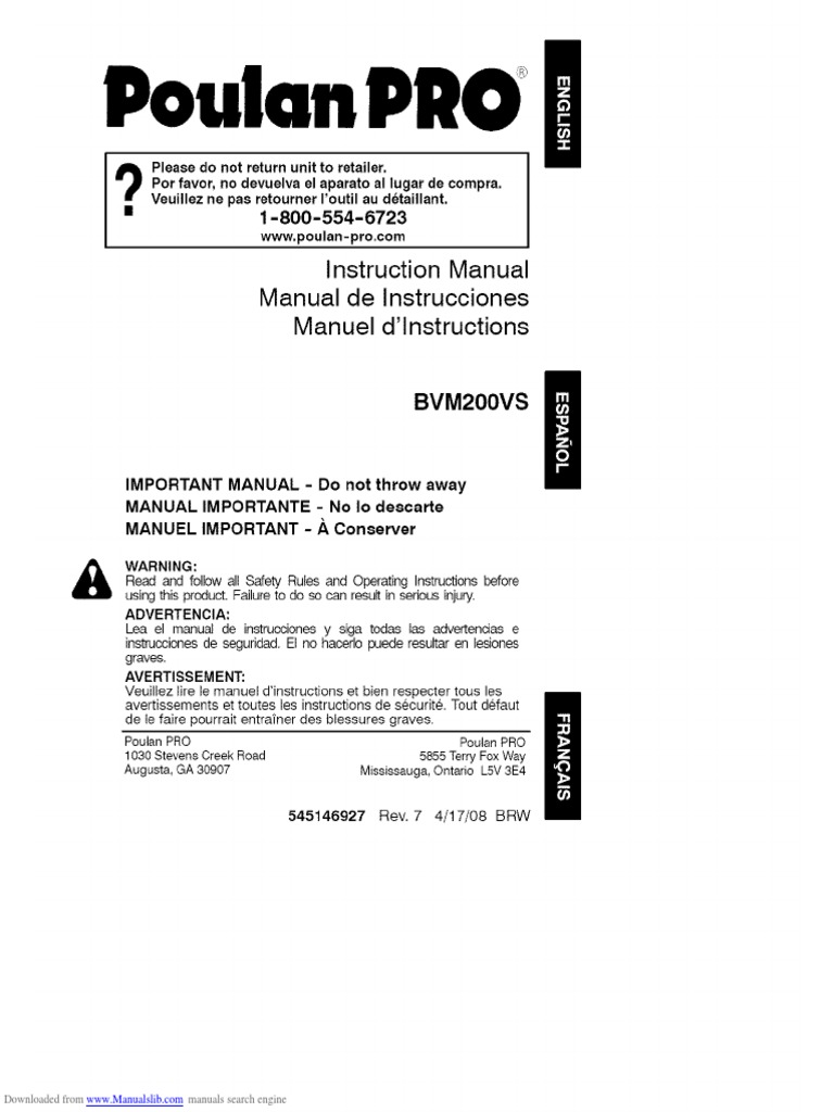 Poulan Pro Blower Bvm200vs Manuals - SOURCE: poulan bvm pro 200 gas blower not getting gas. As a service center for Poulan products the usual problems for not starting I see is compression or the cylinder has come loose from the crankcase.. PoulanPRO ! Por favor, el aparato al lugar de compra. Please do no not devuelva return unit to retailer. Veuillez ne pas retourner I'outil au detaillant. • 1-800-554-6723 www.poulan-pro.com Instruction Manual Manual de Instrucciones Manuel d'lnstructions BVM200VS & IMPORTANT MANUAL MANUAL IMPORTANTE - Do not throw away - No Io descarte MANUEL. Read and download Poulan Pro Blowers BVM200VS User's Manual online. Download free Poulan Pro user manuals, owners manuals, instructions, warranties and installation guides, etc..