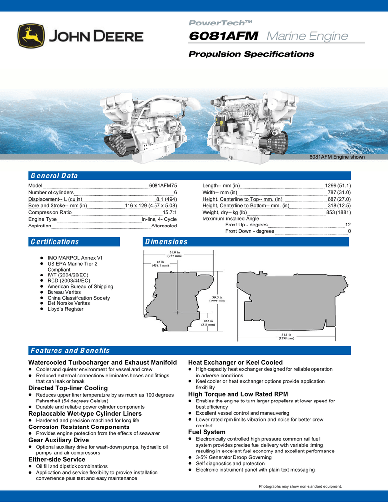 Powertech 6081afm75 Marine Engine Manual - Our 6068AFM75 John Deere workshop manuals contain in-depth maintenance, service and repair information. Get your eManual now! Home ยป Engines Result Pages: 1. John Deere PowerTech 6081AFM75 Marine Engines Operators Manual. $19.99. VIEW DETAILS. The 6081AFM75 is a six-cylinder, turbocharged and air-to-engine coolant aftercooled marine engine. * The PowerTech 6125SFM75 has 12.5L of displacement and provides 455 kW (610 hp). It is the most powerful engine manufactured by John Deere. It is a six-cylinder, electronically controlled, turbocharged and air-to-sea water aftercooled marine. This set of manuals includes technical manual, operator's manual, use and maintennce manual, provides detailed information regarding repair procedures, maintenance instructions, instructions, diagrams and pictures for PowerTech 8.1 L diesel engines John Deere. Electronic manuals have simple and user-friendly interface. Manuals come in PDF.
