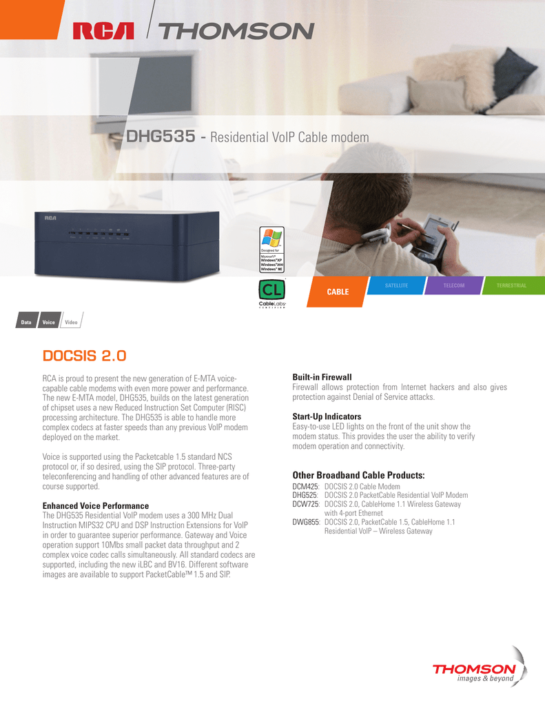 Rca Dhg535 2 Modem Manuals - RCA (Thomson) DOCSIS 2.0 Certified Cable Modem Features: DOCSIS 1.0, 1.1, 2.0 certified. Bridging between the USB and Ethernet port. Easy access to advanced diagnostics web pages. USB port for easy installation. Reliable high-performance platform. Surf the Internet up to 100 times faster than a 56k analog Modem (1) 1 -Compared with a 56 kpbs analog telephone modem. Internet access sold. Find the appropriate categories of RCA products. RCA products sorted by category. Browse and choose what you need.. Rca Dhg 5352 Manual Good Used Condition = RCA DHG535-2 Broadband Docsis 2.0 Voip Modem. with all cords - 1 AC Power cord, 1 USB cord, 1 RJ45 Ethernet cord, instructions..