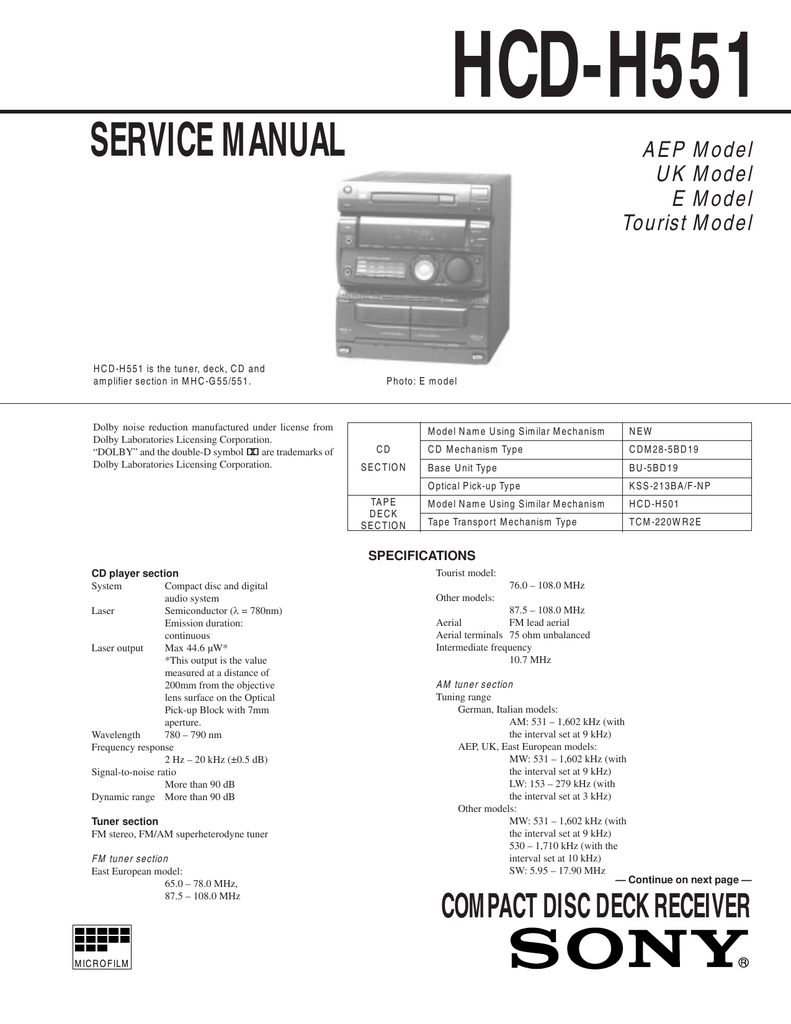 Repair Manuals Sony Hcd H501 Compact Disc Deck Receiver - Page 1. SERVICE MANUAL AEP Model UK Model E Model Tourist Model HCD-H551 is the tuner, deck, CD and amplifier section in MHC-G55/551. Photo: E model Dolby noise reduction manufactured under license from Model Name Using Similar Mechanism Dolby Laboratories Licensing Corporation.. getMANUAL.com - Sell, development, translation of service manuals, user manuals, part catalogues and other technical instructions for audio/visual equipment, home appliances, computers and other devices. Our webstore accepts VISA, MasterCard, Discover and AMEX transactions on-line.. УВАЖАЕМИ КЛИЕНТИ, В МОМЕНТА ФИРМАТА ИЗВЪРШВА САМО ОНЛАЙН ПРОДАЖБИ. Телефон: +359 888 50 50 45.