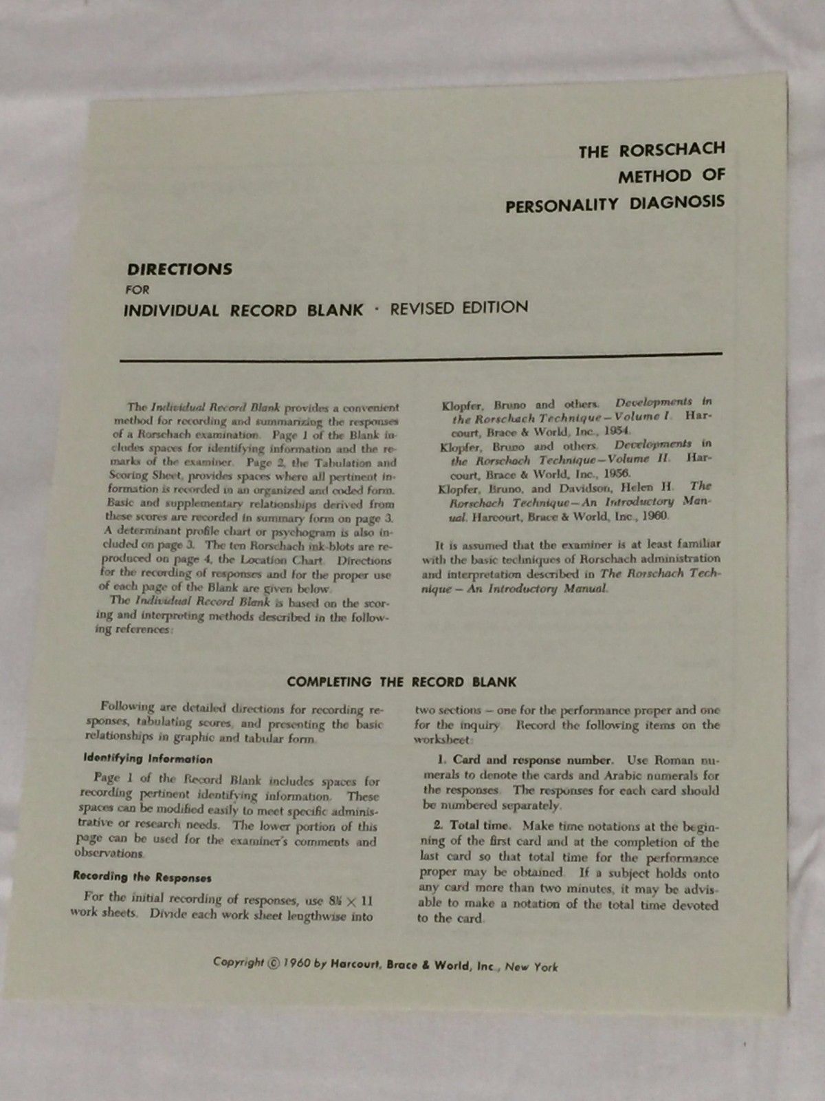 Rorschach Technique An Introductory Manual - The Helsinki Test is a simplification of the Rorschach-type technique, designed so it is possible for the constructor, using manual, the pedagogical publication series of the Institute. of Education. Helsinki, August 18, 1984 as is usually the case with Rorschach techniques. An introduction along the lines of the one suggested by. Managed Care Manual Chapter 5,Rorschach Technique An Introductory Manual By Bruno. Klopfer 19620601,Haynes Home Insulation Manual,Panasonic Cq Bt5107u Service Manual,1999 Ml430 Owners Manual,2016 Shogun Workshop Manual,John Deere D160 Manual,Triumph Speedmaster 2006 Repair Service Manual,Zanussi Zdi 6054 Qx Repair. The Rorschach technique : a manual for a projective method of personality diagnosis / by Bruno Klopfer ; with clinical contributions by Douglas McGlashan Kelley World Book Co Yonkers-on-Hudson, N.Y 1942.