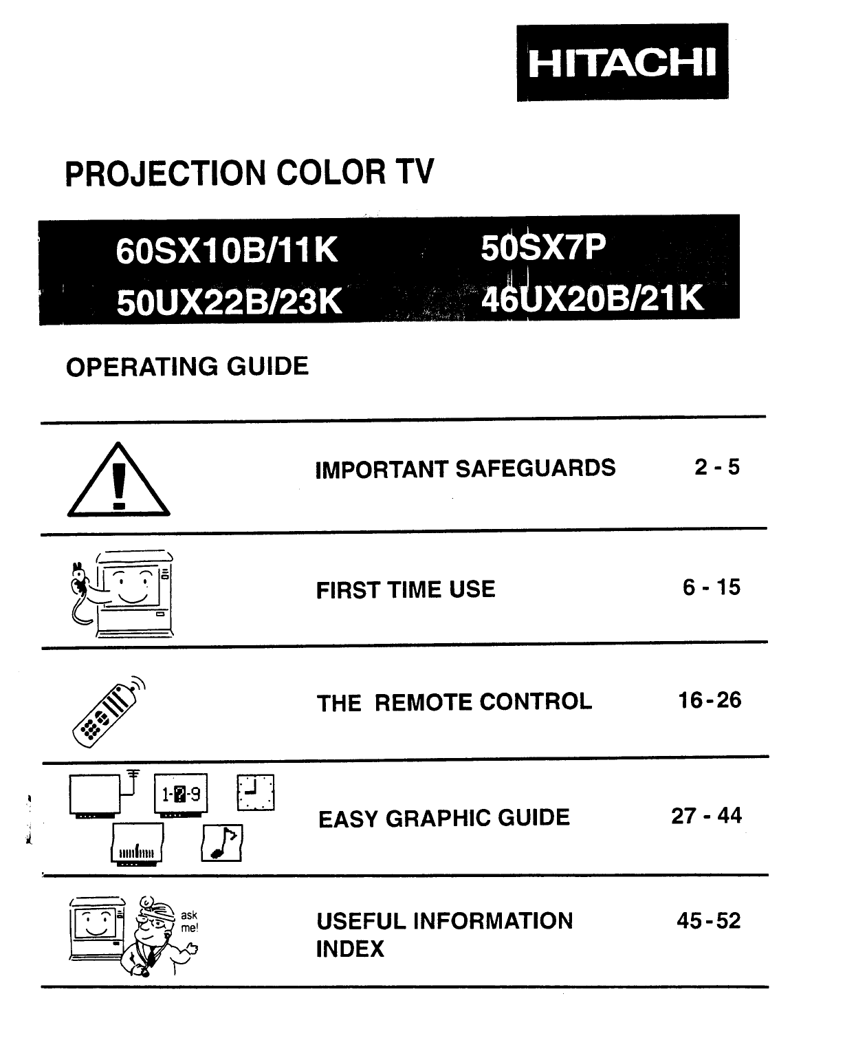 Service Manual Hitachi 50sx7p Projection Color Tv - page 1 projection color tv 61swx10b 53uwx10b 61swx12b 61uwx10b 53swx10b 43uwx10b 53swx12b operating guide important safety instructions first time use 5-22 the genius 23-35 remote control ultratec bit-map video setup audio customize theater 36-70 on.