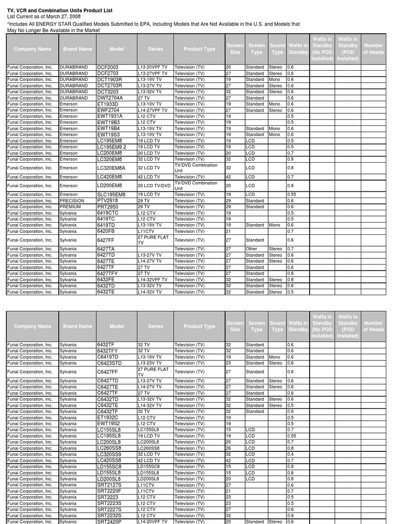 Tv Vcr Prod List | Television | Videocassette Recorder