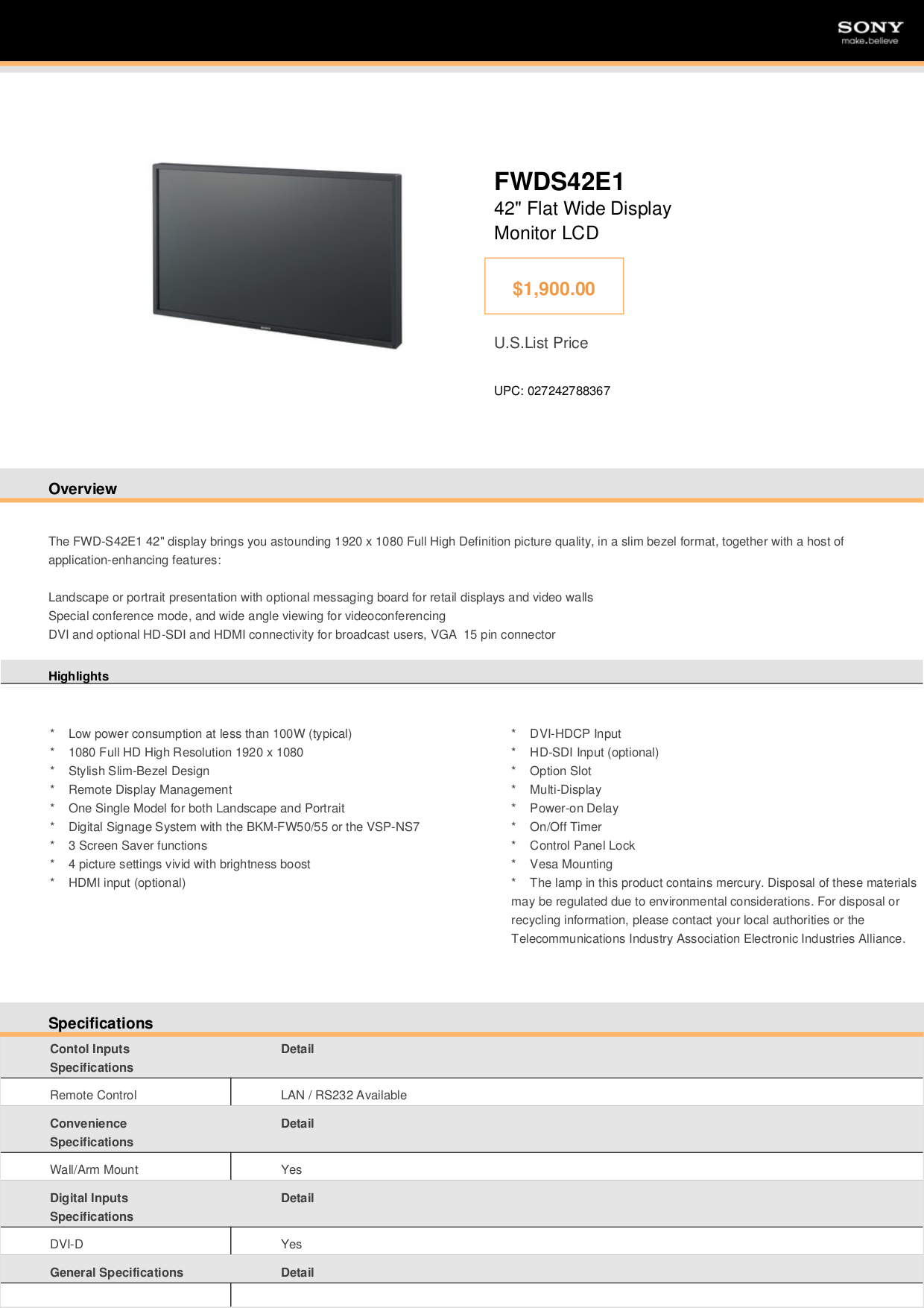 Sony fwd-s42e1 manual