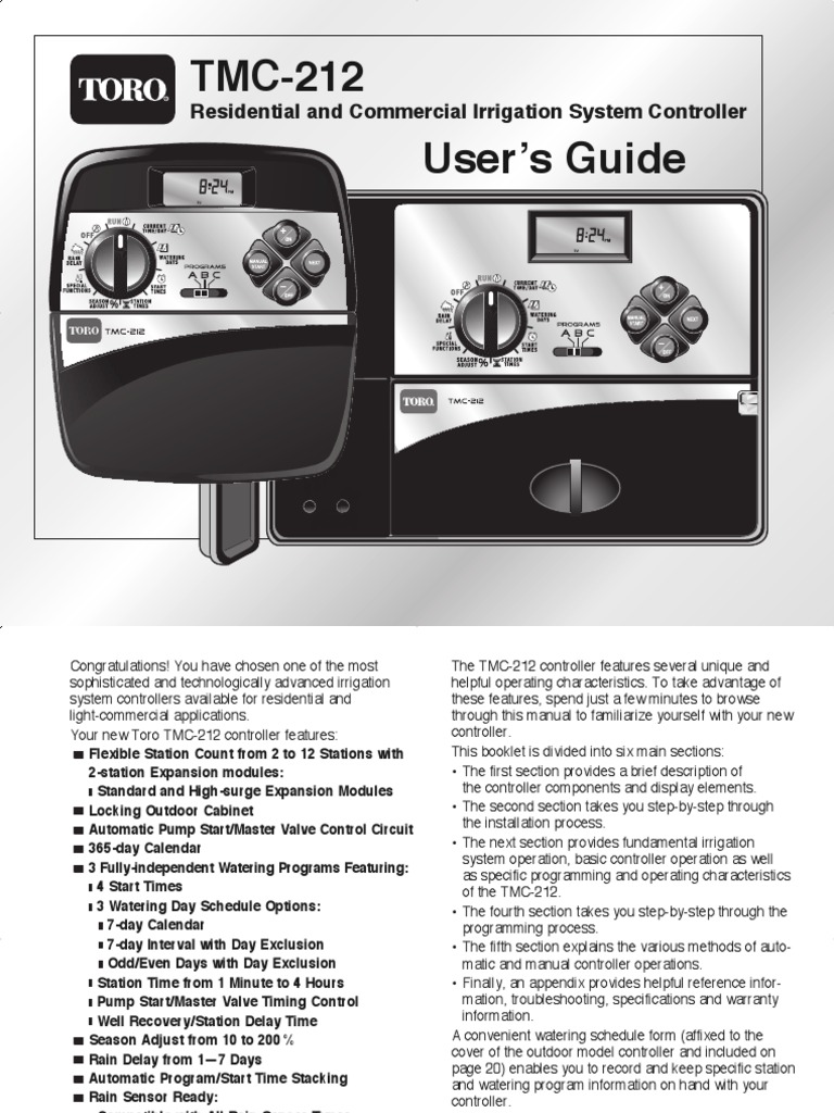 Toro Tmc 212 Manuals Pdf - View and Download Toro TMC-212 user manual online. Residential and Commercial Irrigation System Controller. TMC-212 Controller pdf manual download.. View and Download Toro TMC-424 user manual online. MODULAR CONTROLLER 4 TO 24 STATIONS. TMC-424 Controller pdf manual download.. United States: Charlotte (Nc) Nagaoka, Japan; Cachoeiro De Itapemirim, Brazil; Bissau, Guinea-Bissau; Czestochowa, Poland.