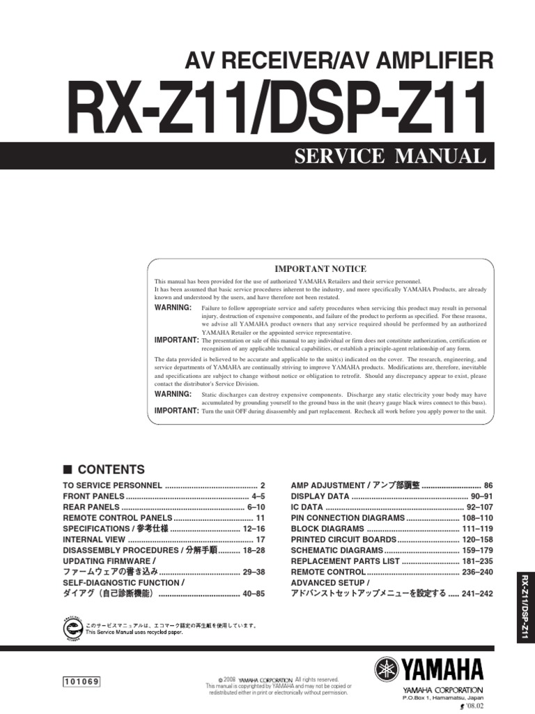 Yamaha Rx Z11 Dsp Z11 Av Receiver Amplifier Service Manuals - AV RECEIVER/AV AMPLIFIER RX-Z11/DSP-Z11 SERVICE MANUAL IMPORTANT NOTICE This manual has been provided for the use of authorized YAMAHA Retailers and their service personnel.. the yamaha rx z11 dsp z11 av receiver amplifier service manual epub download yamaha rx z11 dsp z11 av receiver amplifier service manual in epub format in the website you will find a large variety of epub pdf kindle audiobook and books save yamaha dsp z11 to get e mail alerts and updates on your ebay feed yamaha rx z7 dsp z7 service manual coil bound w protective cover new other 1595 or. Download Yamaha Rx Z11 Dsp Z11 Av Receiver Amplifier Service Manual View and Download Yamaha RX-Z9 service manual online. av receiver/av amplifier..
